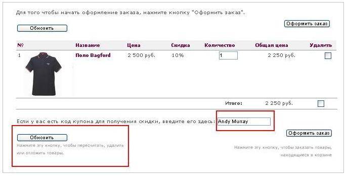 Для того, чтобы активировать купон, нужно положить в корзину понравившееся поло из этого раздела, ввести в соответствующее поле имя нашего чемпиона Andy Murray и нажать кнопку «Обновить». Цена будет пересчитана.