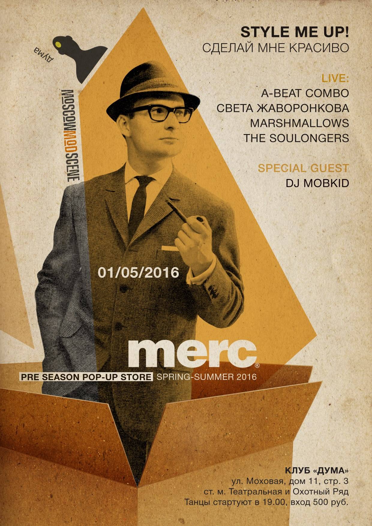Назад в БлогНовое яркое событие в истории выездной активности Merc на тематических мероприятиях в Москве состоится в Первомай. На концептуальной ретро вечеринке «Style Me Up» с участием известных столичных музыкантов и ди-джеев развернется фирменный Pop-Up магазин, где практически с колес будет представлена новая коллекция Весна-Лето 2016.