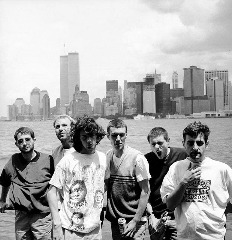 1987 — Английская группа Happy Mondays (слева направо: клавишник Пол Дэвис, гитарист Марк Дэй, барабанщик Гэри Уилан, танцор Без, вокалист Шон Райдер и басист Пол Райдер) на борту парома Статен-Айленд в Нью-Йорке. Источник |