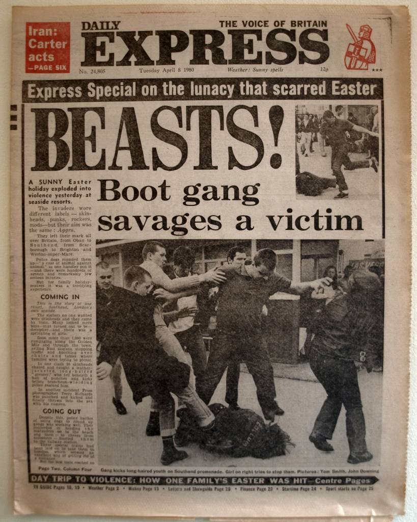 «Чудовища» — первополосный заголовок еще одного британского таблоида («Дейли экспресс») об уличных зверствах модов и скинхедов, прокатившихся по всей стране во время Bank Holiday весной 1980-го. Неспокойное было время. Источник |