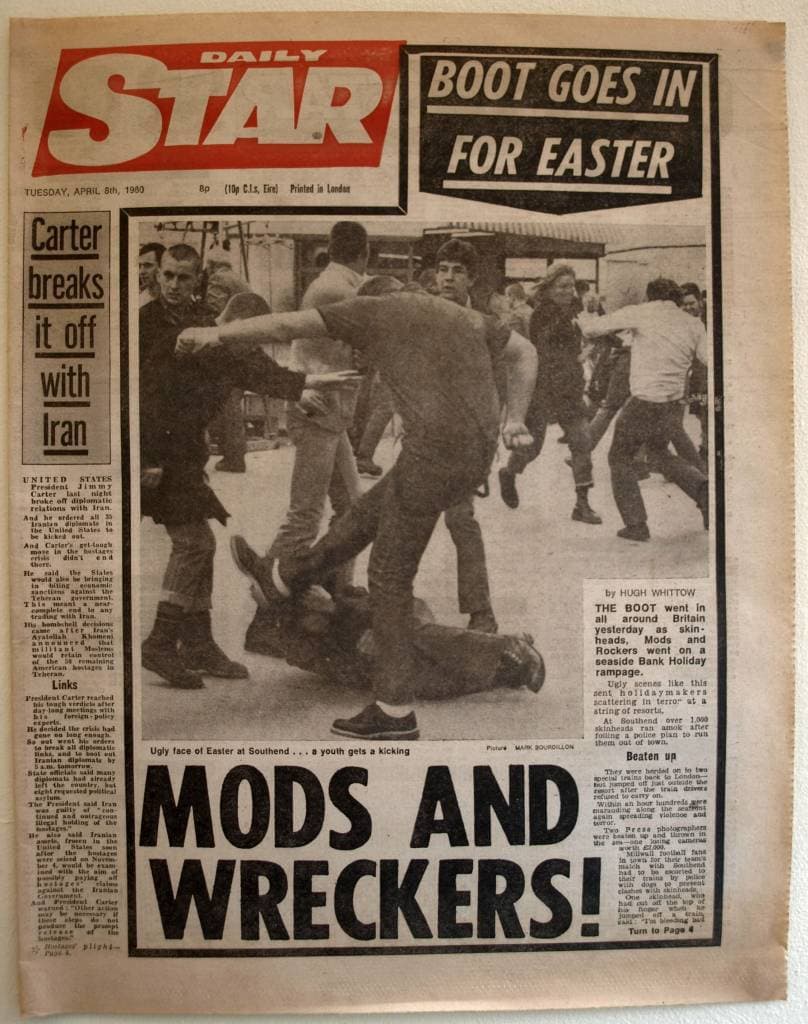 Первая полоса британского таблоида Daily Star, посвященная традиционным беспорядкам с участием модов, скинхедов и рокеров во время Bank Holiday, Апрель 1980. Источник |