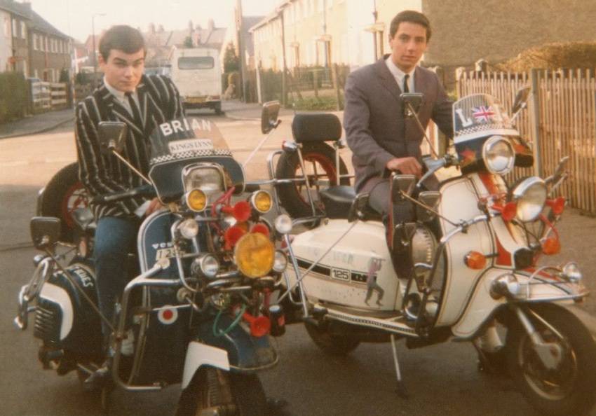 Пиджак в полоску, костюм Tonic, белые рубашки button-down и узкие галстуки – типичный лук эпохи Mod Revival. Ну и скутеры, во всем своем блеске! Англия, 80-е. Источник |