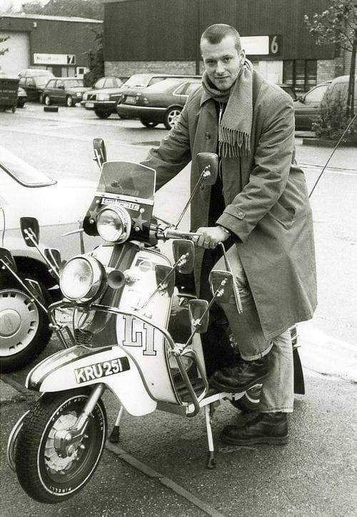 Эталонный хард мод – короткая стрижка, макинтош, светлые джинсы на подворотах, мартина и скутер Lambretta, Англия, 80-е. Источник |