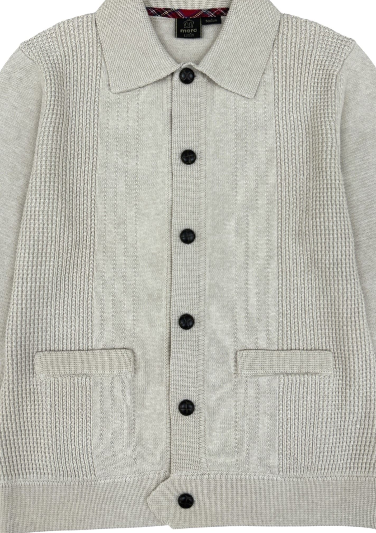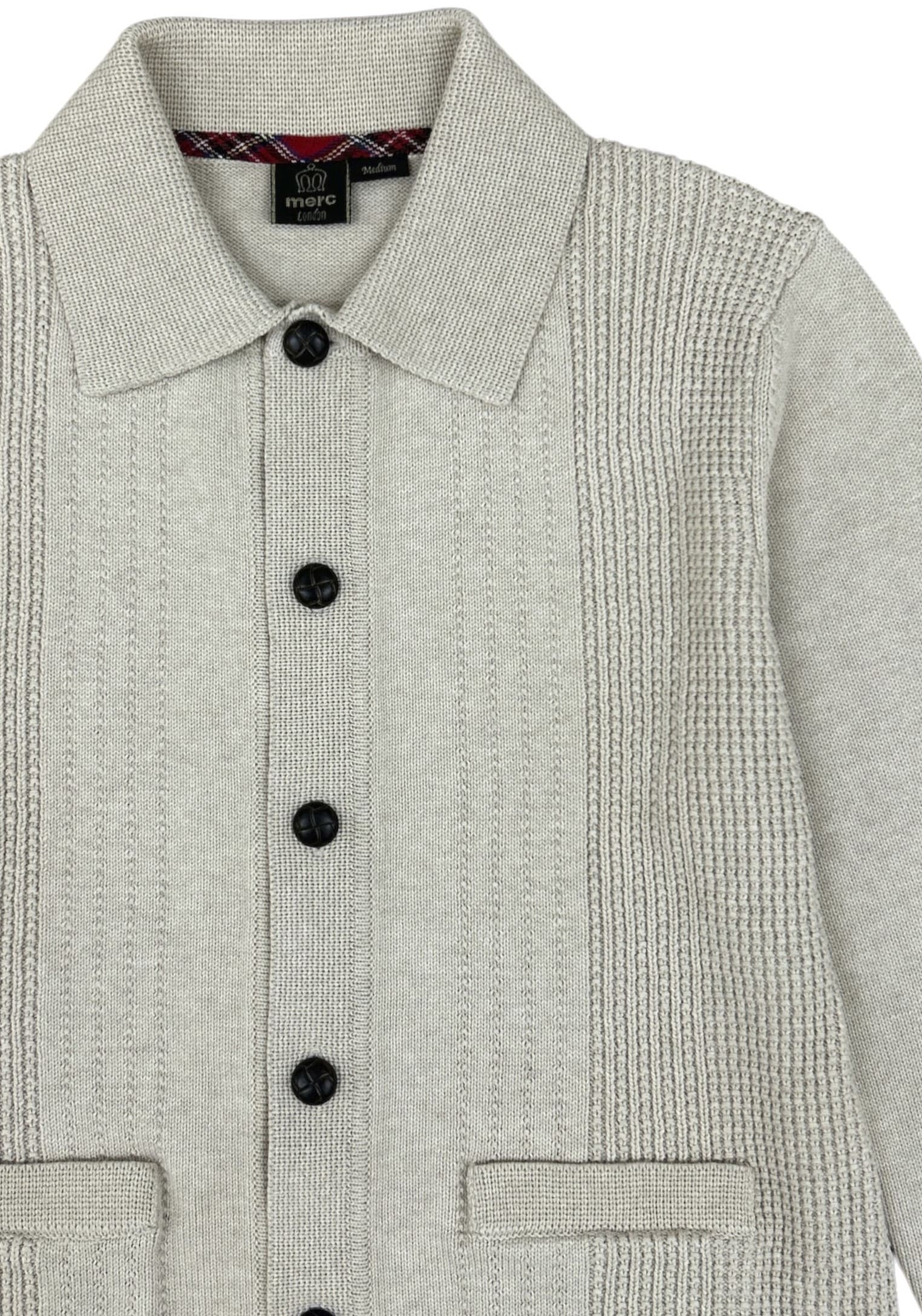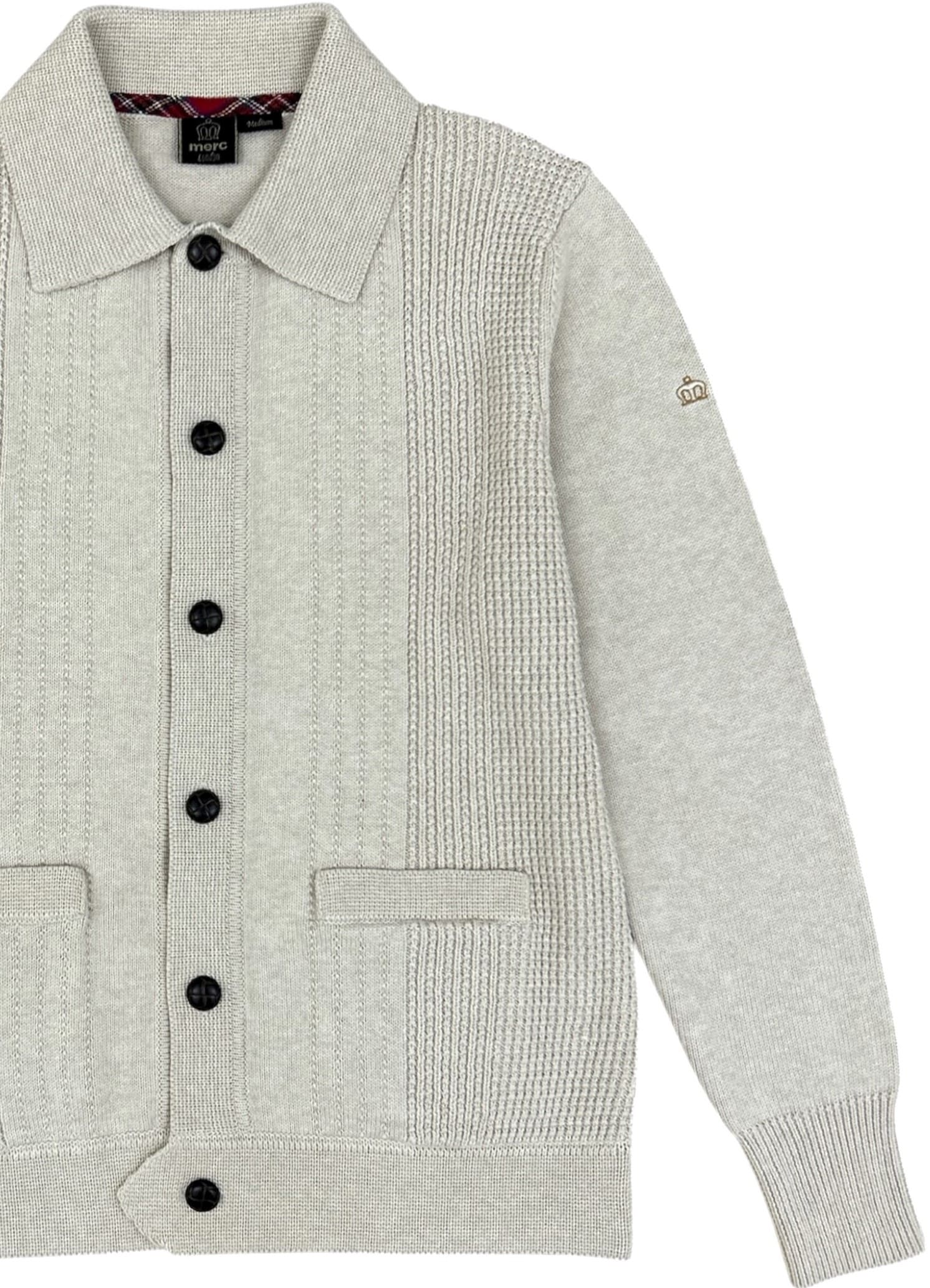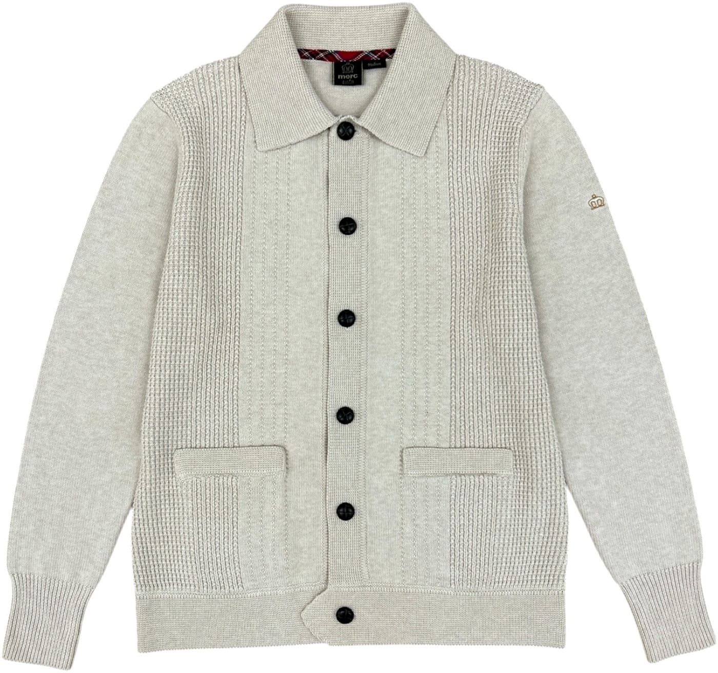 Потрясающий образец винтажа на пересечении практичной smart casual классики и наследия британских субкультур 60-80-х, «Лотто» привносит в современный гардероб аутентичные нотки ретро-эстетики, оставаясь строгим и универсальным дизайном на выход или на каждый день. Скроенный из натурального трикотажа средней плотности в мягком бежевом оттенке экрю-меланж, это идеальная вещь для многослойности, которую можно носить застёгнутой на рубашку или в расстёгнутом виде поверх футболки для более расслабленного, но выдержанного стиля. Богатая фактура полотна раскрывается через характерные для моды того времени рельефные узоры в тон, сообщающие изделию выразительную геометрию и объём. Четкий в своей лаконичности образ, основанный на тщательном внимании к деталям, таким как скругленные рельефные «футбольные» в духе традиционного английского трикотажа, фигурный низ планки на манер вязаных поло 50-60-х и накладные карманы, отсылающие к кардиганам скинхедов и руд-боев эпохи 2 Tone. Манжеты и пояс выполнены английской резинкой для аккуратной посадки. Завершает композицию наш фирменный лого Корона, тщательно вышитый на рукаве, и тартановая окантовка внутренней горловины — еще один характерный штрих бренда. [Цвет производителя — ecru marl]
