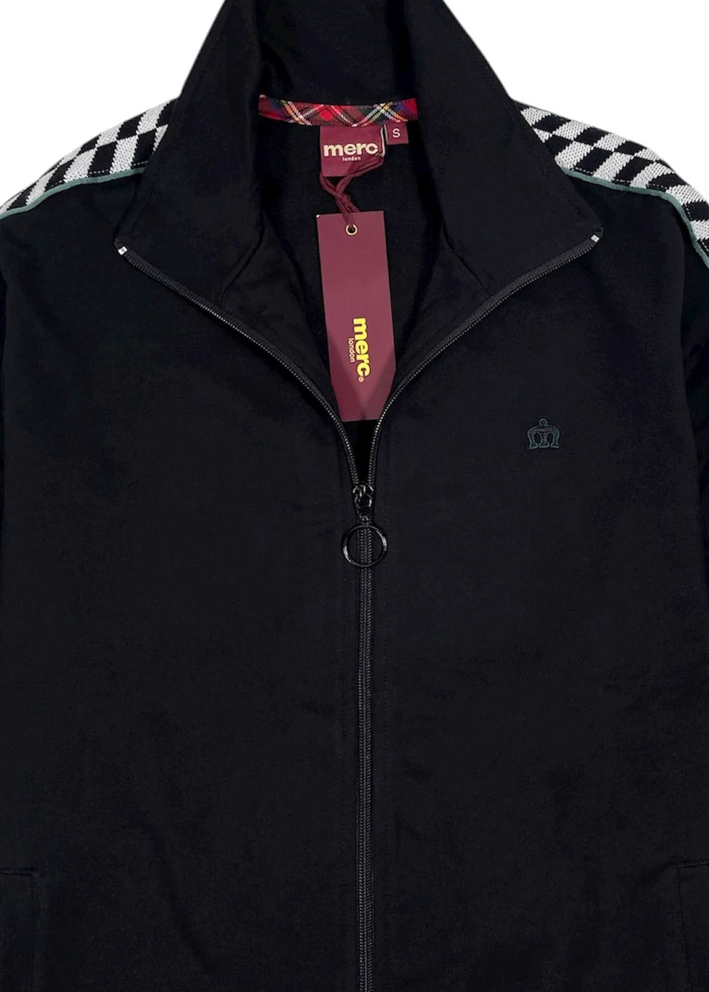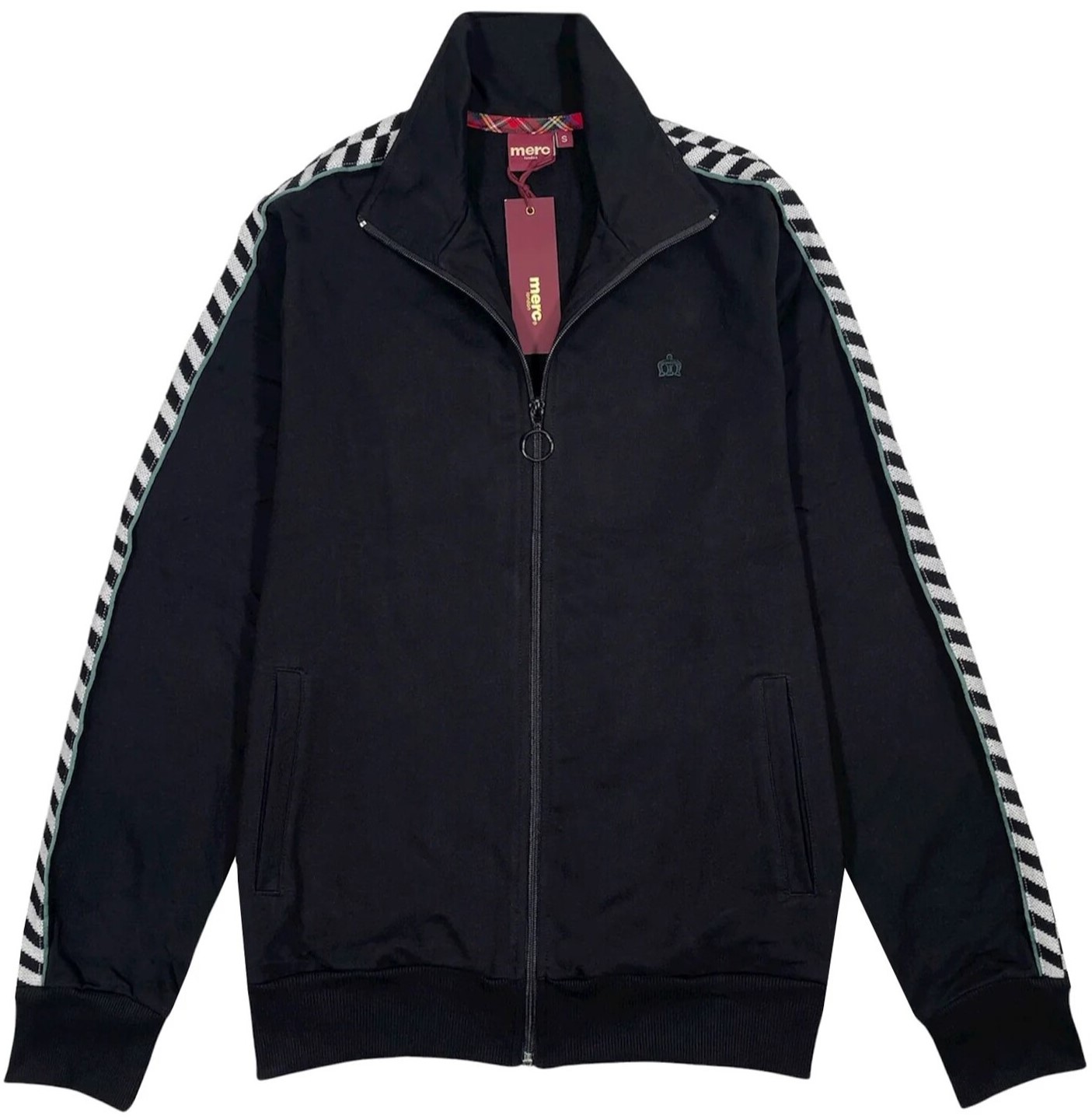 Спортивная классика, навеянная любовью к ска-музыке и эпохе 2 Tone, олимпийка «Кевин» создана из мягкой и дышащей ткани френч терри (двухниточный футер) универсальной черной расцветки. Традиционный декор на рукавах воплощён в виде трикотажной ленты с узором в черно-белую шашечку и эффектной золотистой окантовкой, гармонирующей с нашим культовым лого Merc Crown, бережно вышитым на груди. Воротник-стойка, манжеты и пояс выполнены из эластичной рибаны, обеспечивающей комфорт и тщательную посадку. Образ дополняют фирменные детали: узнаваемый тартановый ярлычок на боковом шве и круглый пуллер на бегунке — ностальгический акцент в духе ретро-эстетики. Сделано в Португалии. [Цвет производителя — black]