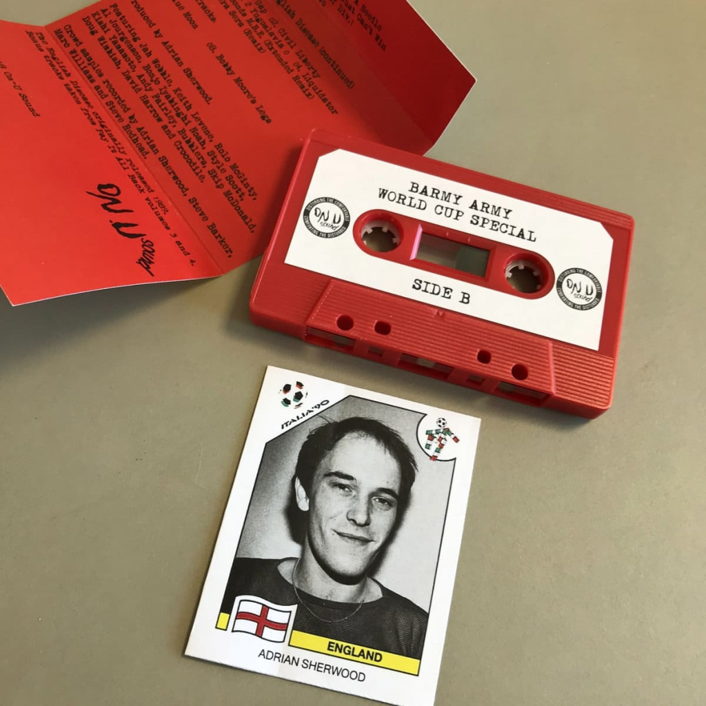 Британский музыкальный продюсер, основатель лейбла On-U Sound Адриан Шервуд на шуточной карточке в стиле Panini, где он изображён как футболист сборной Англии для промо-кассеты World Cup Special, выпущенной его проектом The Barmy Army. Источник |