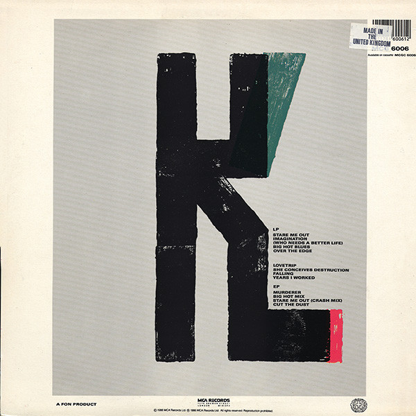 Задняя обложка альбома «10 Days in an Elevator» от британцев Chakk. Большая буква «K» — часть названия группы и элемент фирменного дизайна. Остальные буквы также появлялись на других обложках, образуя визуальный код коллектива. Источник |