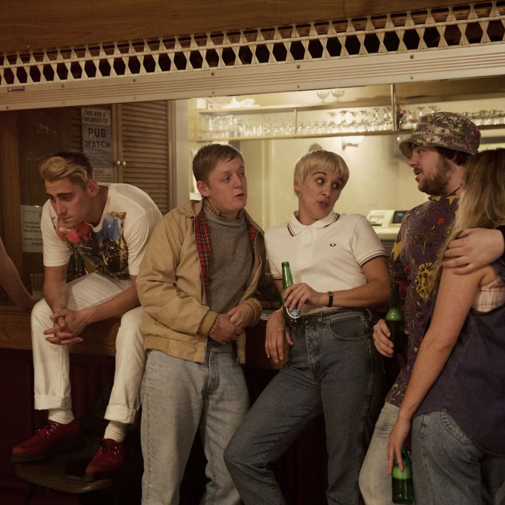 Кадр из фильма Шейна Медоуза This Is England ’90 — знаковая сцена с вечеринки, где играют Happy Mondays: эпизод позволяет оценить степень влияния группы на британскую молодёжную культуру рубежа 80-90-х. Источник |