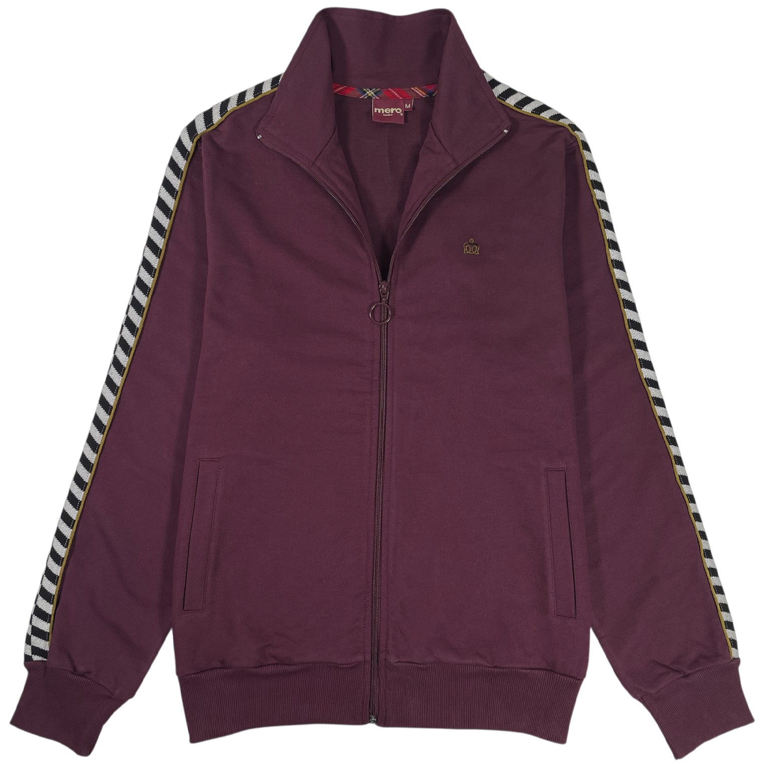 Спортивная классика, навеянная любовью к ска-музыке и эпохе 2 Tone, олимпийка «Кевин» создана из мягкой и дышащей ткани френч терри (двухниточный футер) глубокого бордового оттенка. Традиционный декор на рукавах воплощён в виде трикотажной ленты с узором в черно-белую шашечку и эффектной золотистой окантовкой, гармонирующей с нашим культовым лого Merc Crown, бережно вышитым на груди. Воротник-стойка, манжеты и пояс выполнены из эластичной рибаны, обеспечивающей комфорт и тщательную посадку. Образ дополняют фирменные детали: узнаваемый тартановый ярлычок на боковом шве и круглый пуллер на бегунке — ностальгический акцент в духе ретро-эстетики. Сделано в Португалии. [Цвет производителя — wine]