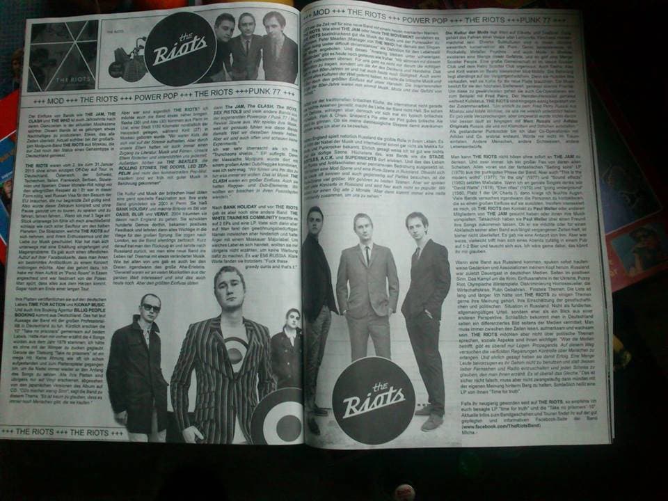 Быть The Riots значит быть бунтарем. Бунт против серости, однообразия, скуки и отсутствия индивидуальности — это именно то, чем мы занимаемся, и выражаем себя не только посредством музыки, но и всеми другими возможными способами. Например, одежда и то, как мы выглядим, для нас является очень важным способом самовыражения: тем, что даёт нам возможность подчеркнуть свою индивидуальность, чувство стиля. Это один из многих аспектов, позволяющий нам говорить о нашей причастности к движению модов. Мод-культура не имеет ни временных, ни географических ограничений. Это просто состояние души. Once a mod, always a mod.