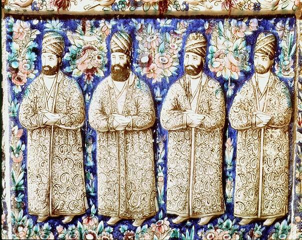 Керамика середины XIX века — религиозные и политические советники четвёртого шаха Ирана Насер ад-Дин Шах Каджара, облаченные в халаты с узором пейсли. Источник |